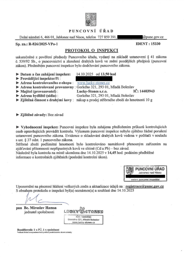 Na základě protokolu z kontroly můžeme s radostí potvrdit, že u nás nebyly zjištěny žádné závady. Všechny šperky jsou řádně označené, odpovídají deklarované ryzosti a splňují požadavky Puncovního zákona.
