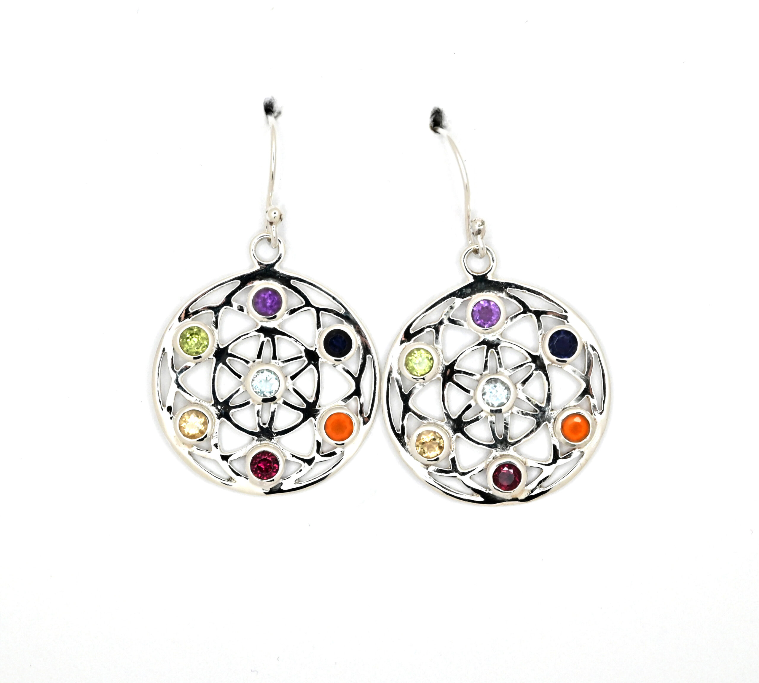 Stříbrné čakrové náušnice ve tvaru kruhu.