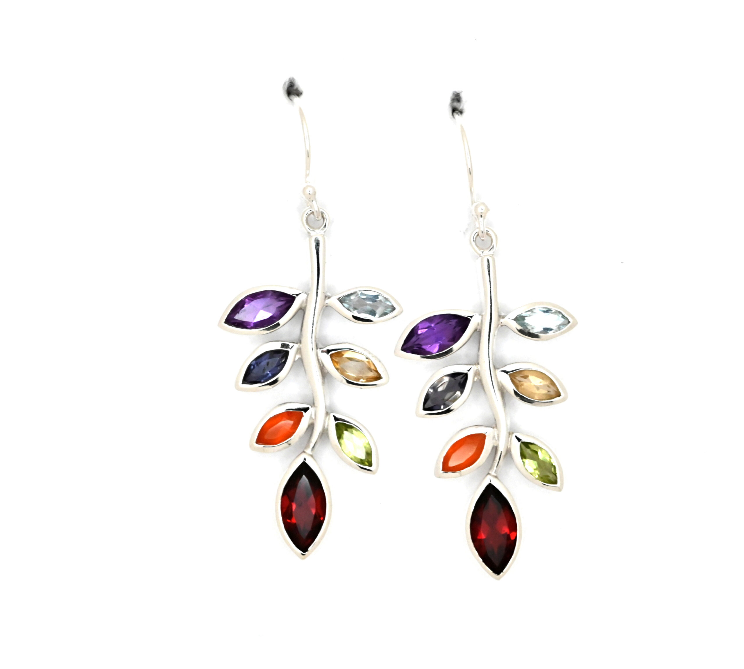 Stříbrné čakrové náušnice ve tvaru stromečku.