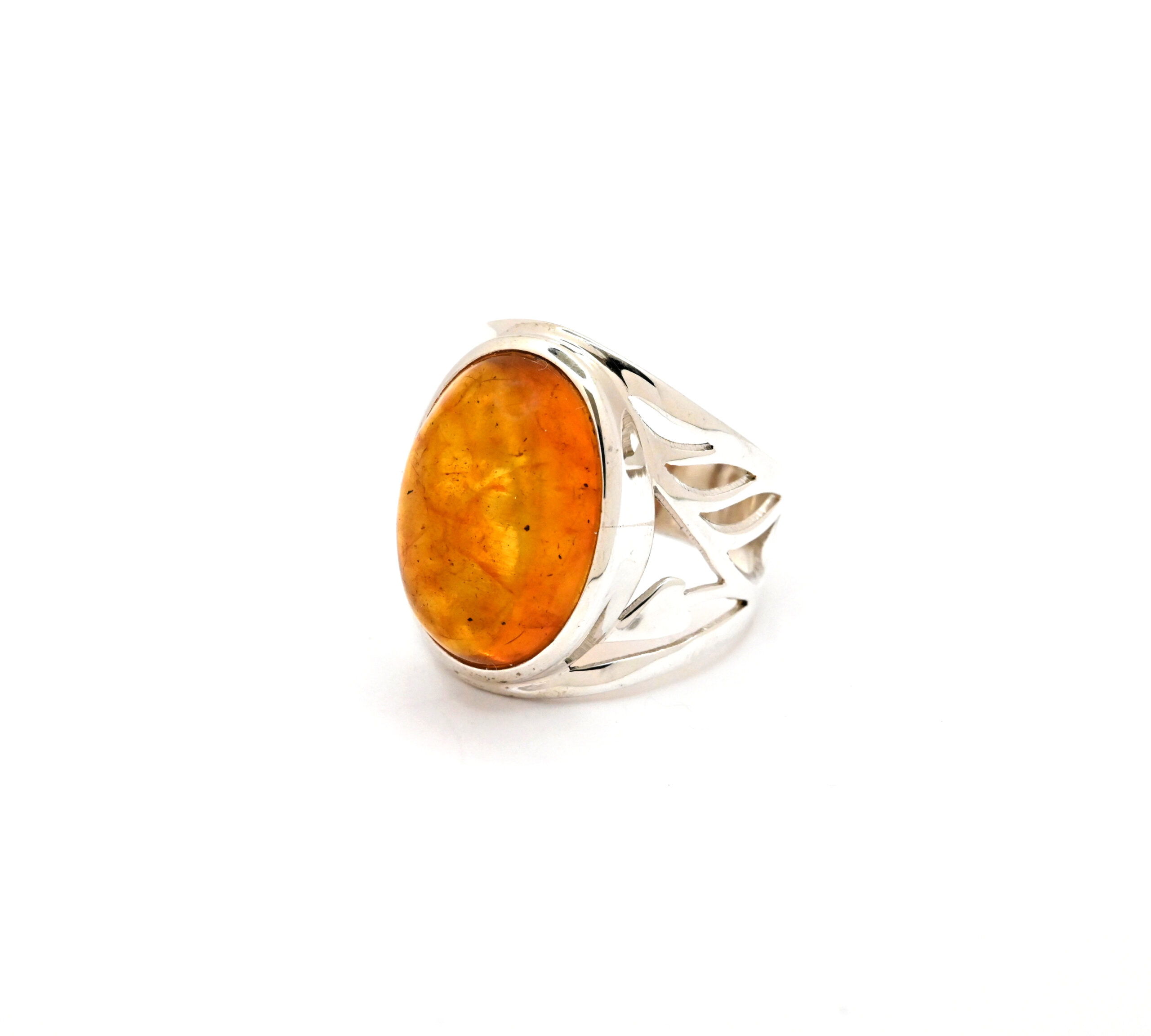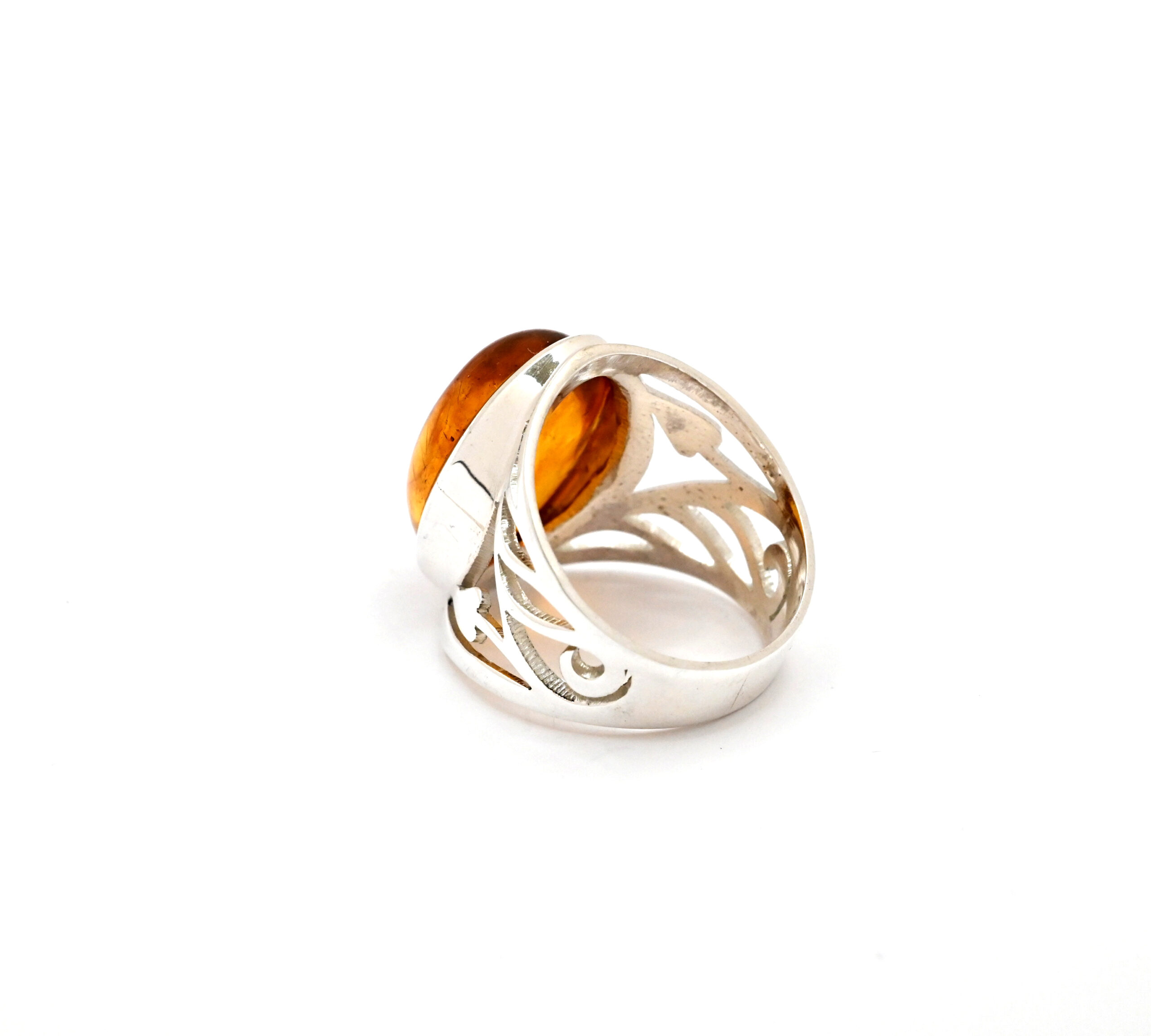 Stříbrný prstýnek s oválným jantarem, zdobený
